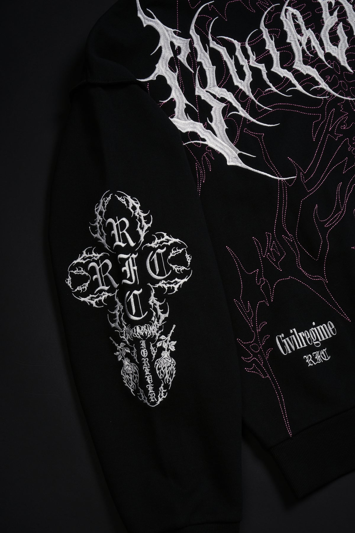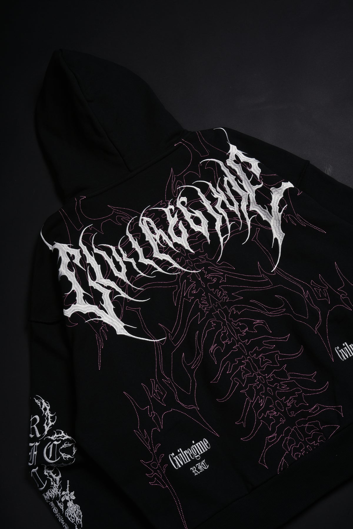 Surging Through The Blossoms Outliers Distressed Zip Up Hoodie in Black/Pink