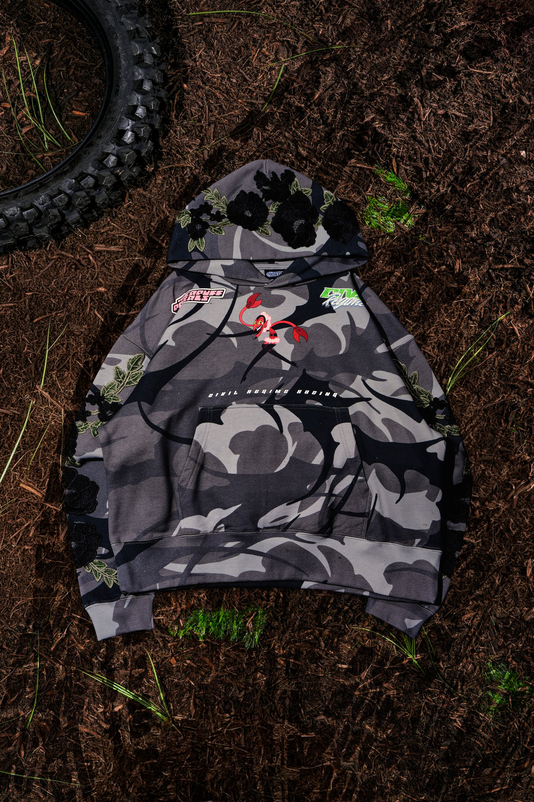 Stray Roses Hoodie in Charcoal Camo