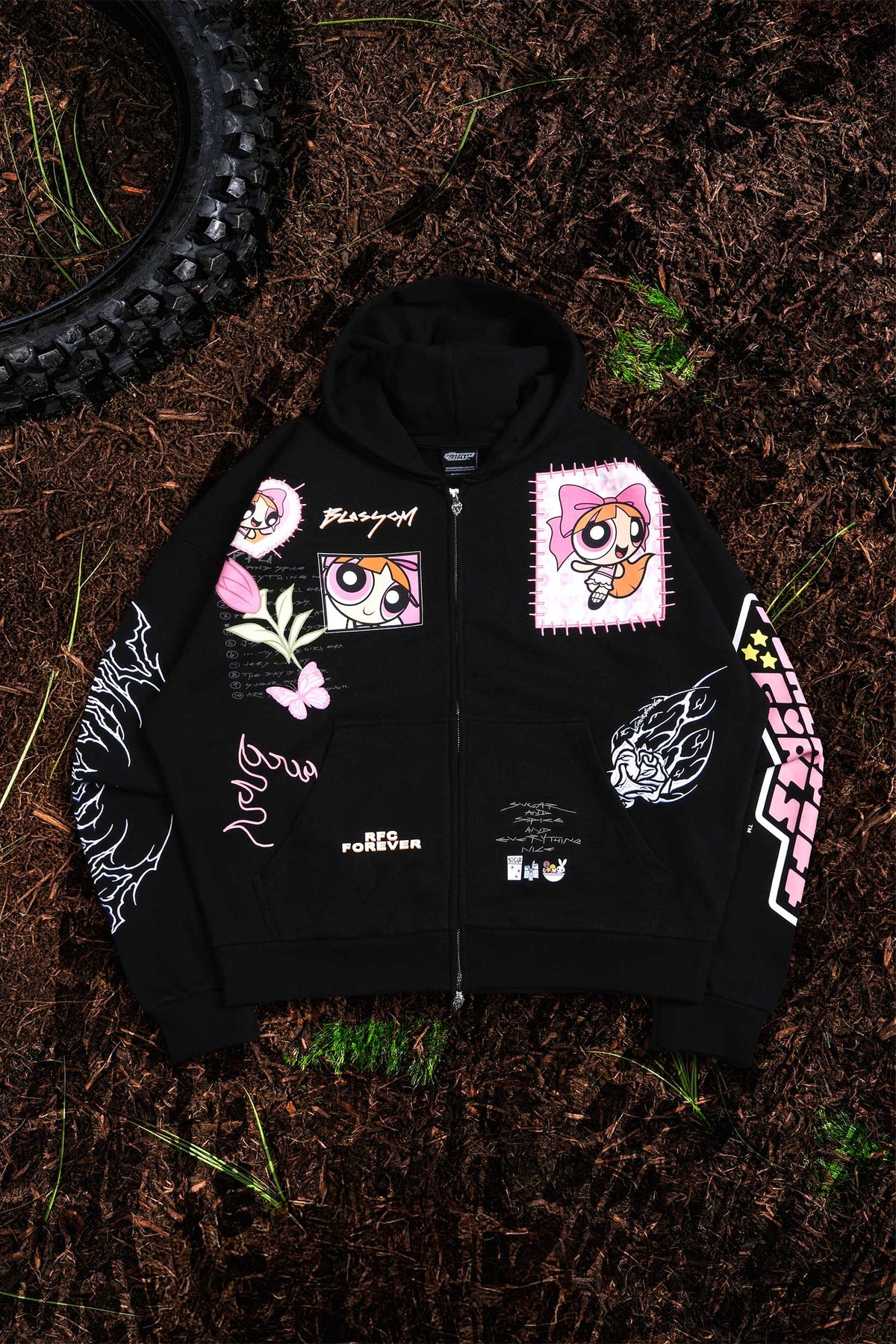 Blossom's Spirit Distressed Zip Up Hoodie in Black