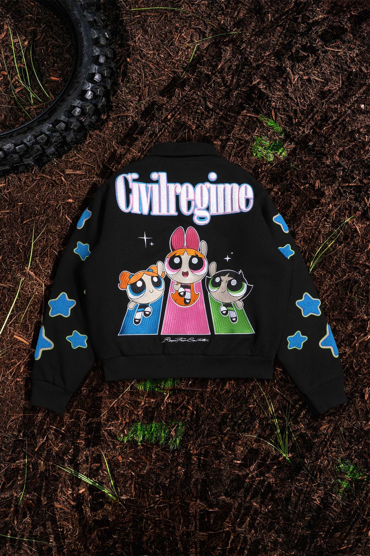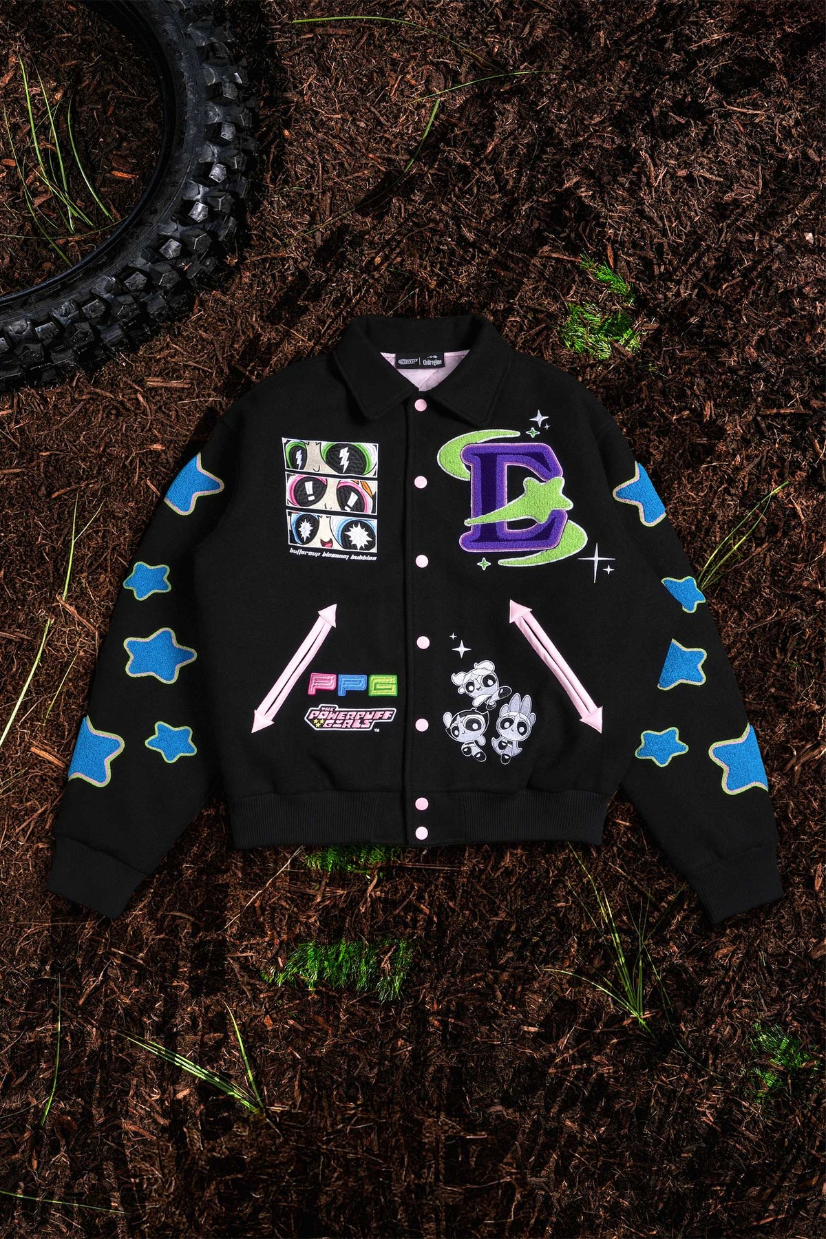 Interstellar Bloom Collared Letterman Jacket in Black