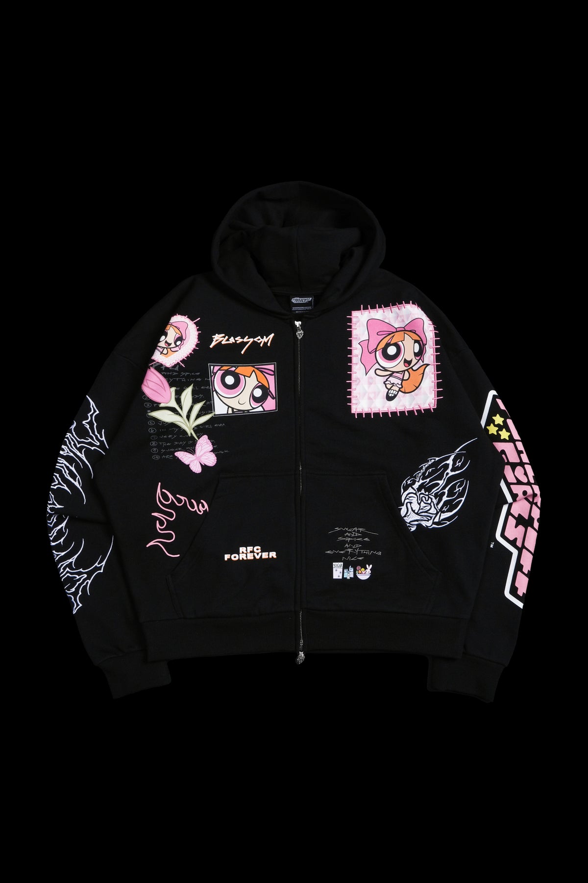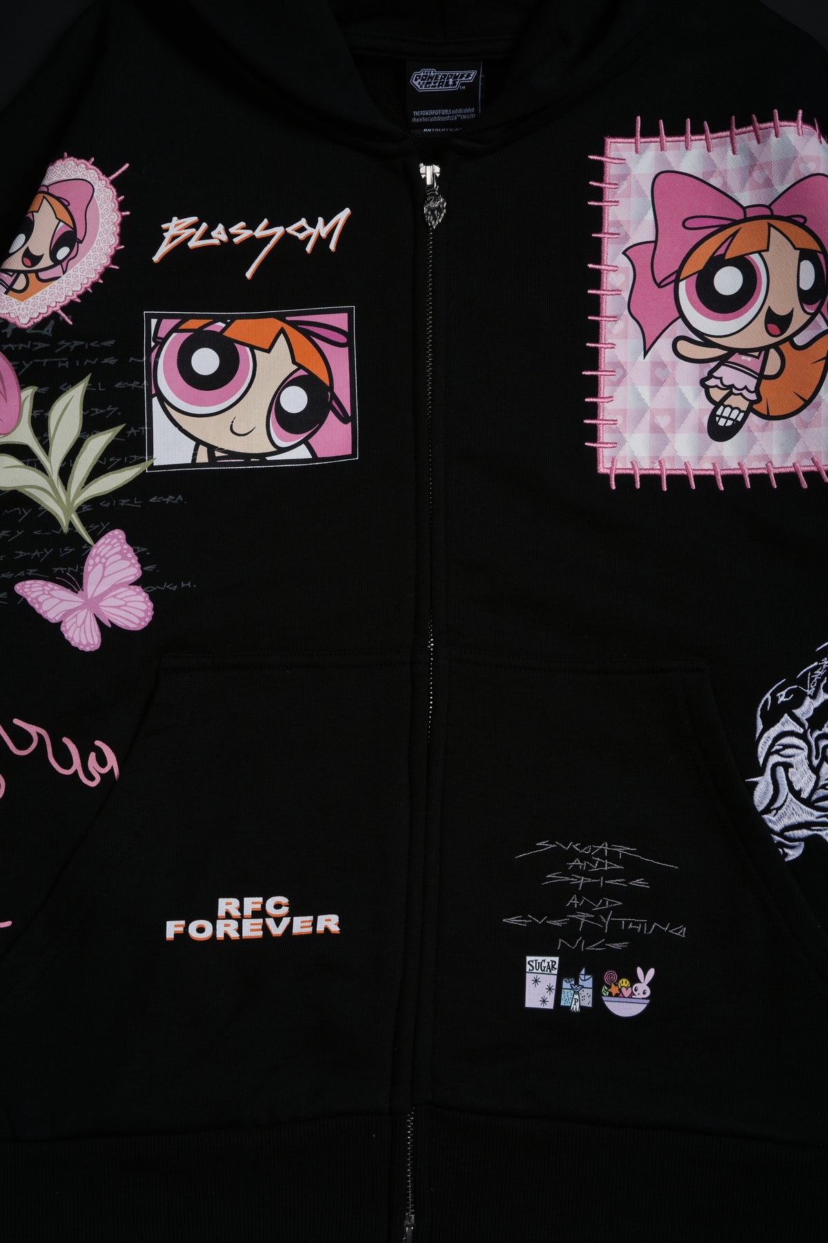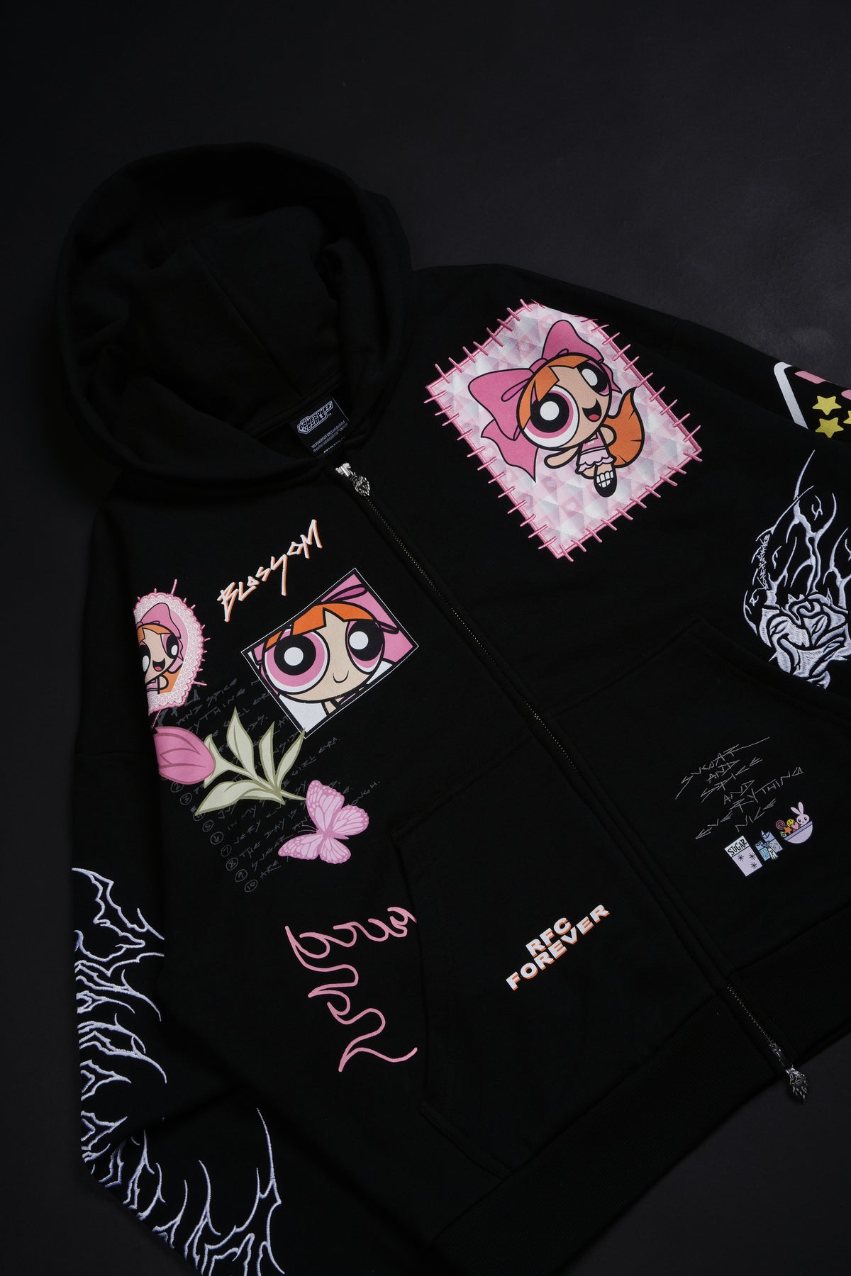 Blossom's Spirit Distressed Zip Up Hoodie in Black
